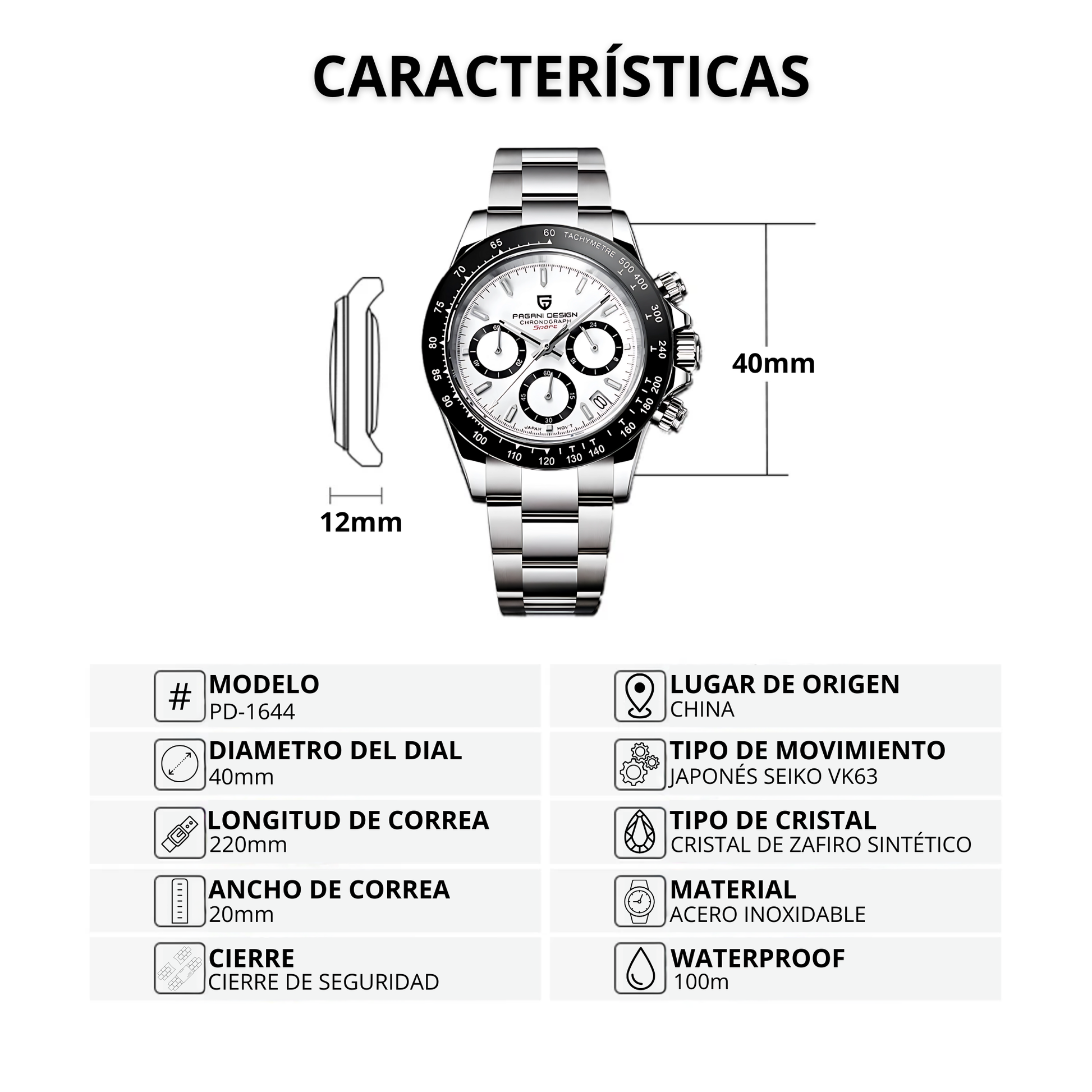 En su interior late el prestigioso movimiento Seiko VK63 de cuarzo japonés, reconocido mundialmente por su exactitud y fiabilidad. Cada segundo cuenta, y con este cronógrafo tendrás la seguridad de llevar la precisión siempre contigo.